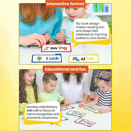 Ideal for reading games, this read and rhyme flip activity book allows children to explore rhyming words within word families, supporting fluency and making reading a fun, dynamic adventure.