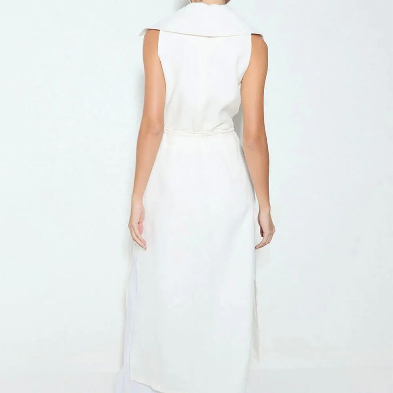 V-NECK SLEEVELESS TOP – The sleeveless top features a clean V-neckline for a composed finish. Its length brings graceful vertical lines and visual balance, making it a standout piece whether worn alone or as part of the set.